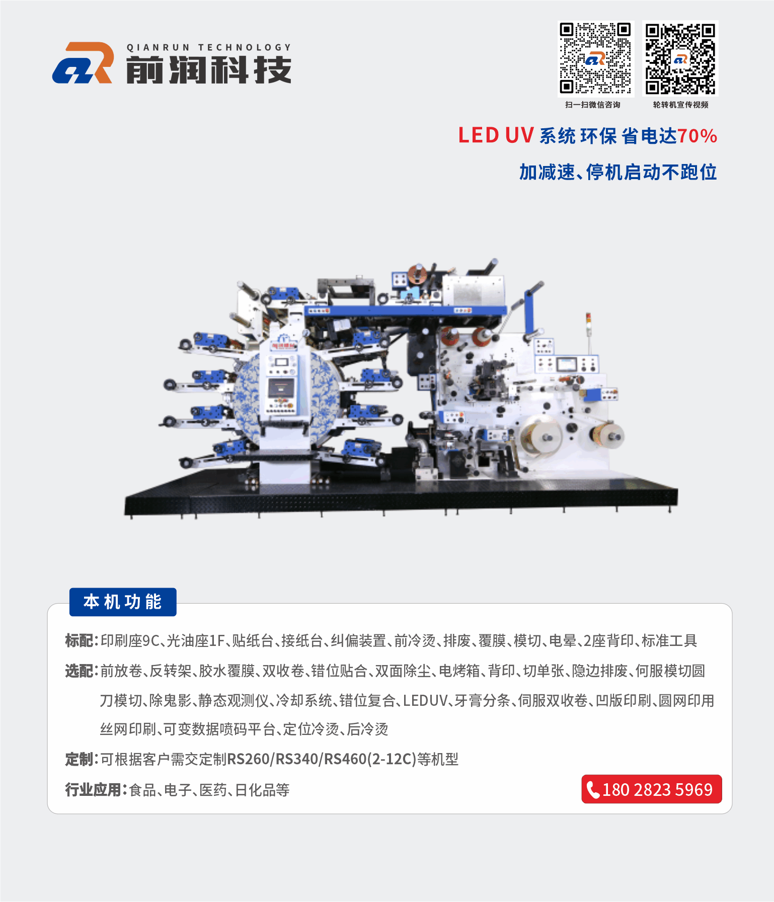 主營設備商標印刷機、衛星式輪轉印刷機、模切機 等產品,公司可為客戶量身制定商標機、輪轉機等自動化解決方案。公司有強大的研發體系,確保能為客戶量身定制各類非標且最有價值的產品;前潤機械在國內外擁有極高的市場占有率及良好的信譽,贏得了眾多知名企業的青睞與合作,產品暢銷多個國家和地區,市場銷量近萬臺;我們愿與您攜手合作,建立長久雙贏機制,共享成功喜悅!加盟熱線:133 2260 8282